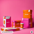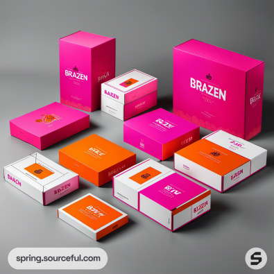 Bold pink and orange packaging boxes against pink backdrop.