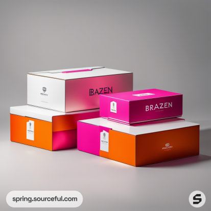 Bright pink and orange packaging boxes with geometric designs.