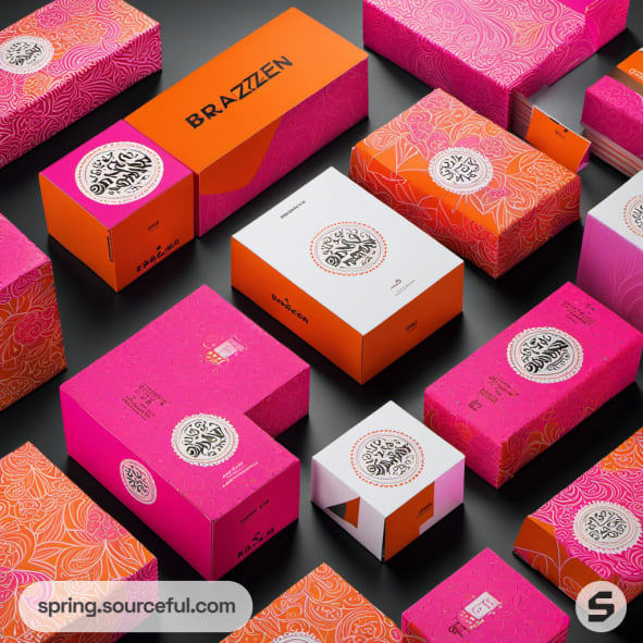 Pink and orange packaging boxes with abstract patterns.