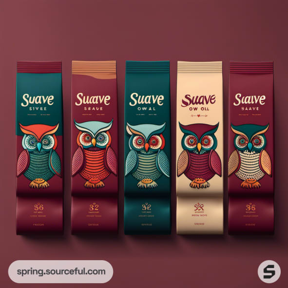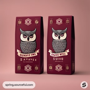 Burgundy cartons with detailed owl illustrations.