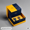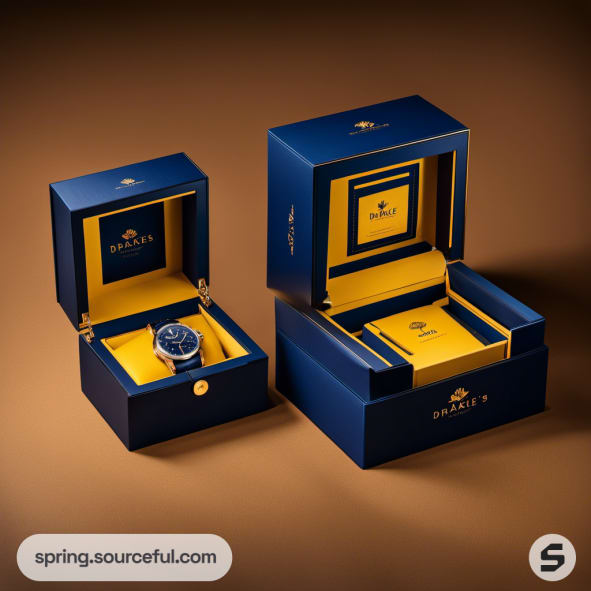 Navy and yellow boxes showcasing watches in elegant packaging.