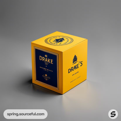 Yellow and blue cube box with branded design, featuring a logo and text on a gray background.