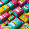 Display of variously shaped packages in vibrant colors with geometric designs.