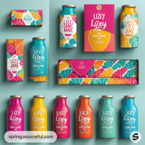 Assorted teal and yellow bottles with abstract designs and bold text.