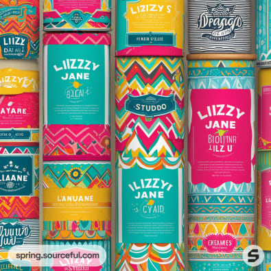 Bright packaging with vibrant geometric floral designs in multiple colors.