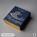 Navy and gold box with fish illustration and wave design.
