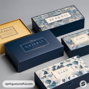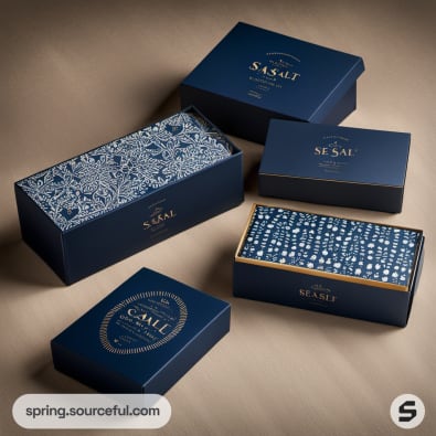 Navy and patterned luxury boxes on beige background.