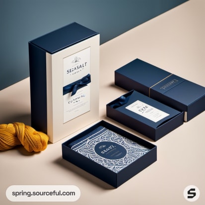 Elegant navy and yellow packaging boxes with minimalist design.