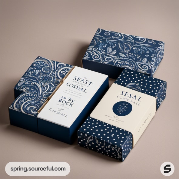 Blue and white floral and dotted luxury packaging boxes on beige surface.