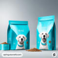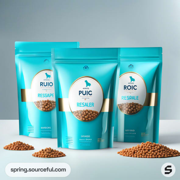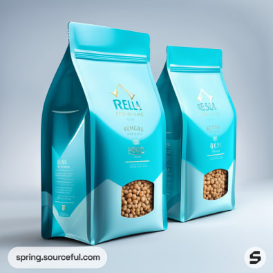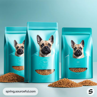 Turquoise resealable dog food pouches with a dog image, filled with brown kibble, on a light blue background.