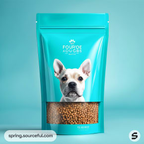 Teal resealable pouch with cute dog image and visible kibble window, on a light blue background.