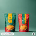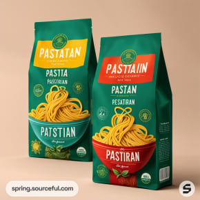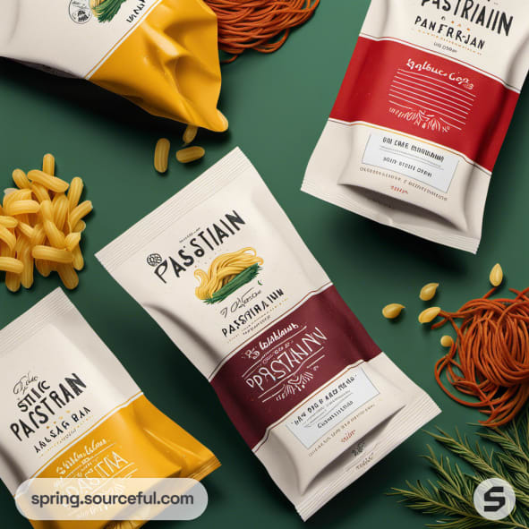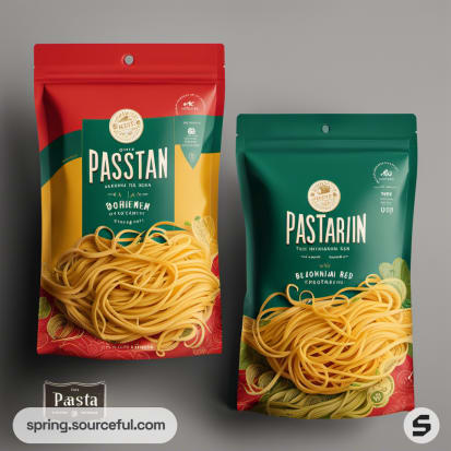 Two colorful pasta pouches with spaghetti on a plain background, featuring modern label design.