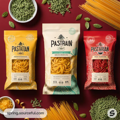 Trio of pasta packs in green, yellow, and red on a soft blue background, featuring vibrant modern packaging.
