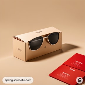 Beige cardboard box with black sunglasses graphic, containing sunglasses.
