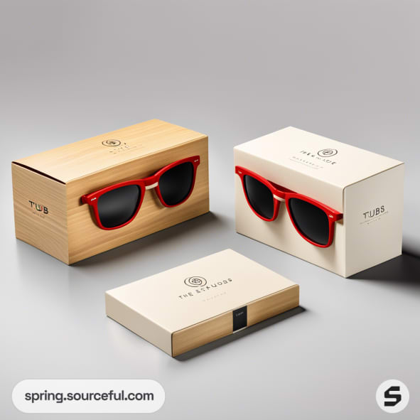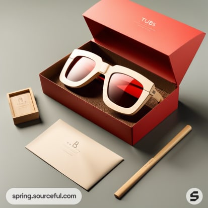 Beige box packaging with red sunglasses placed on top, on a brown background.