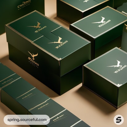 Multiple green boxes with sleek and uniform branding.