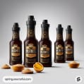 Five dark bottles with gold labels, with sliced nuts.