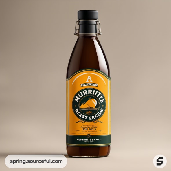 Amber glass bottle with yellow and green label on beige background.