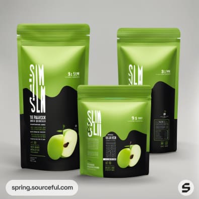 Green resealable pouches with apple graphics.