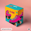 Colorful roller skates in front of pink and orange packaging.