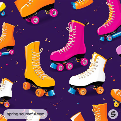 Pattern of brightly colored roller skates on dark background.