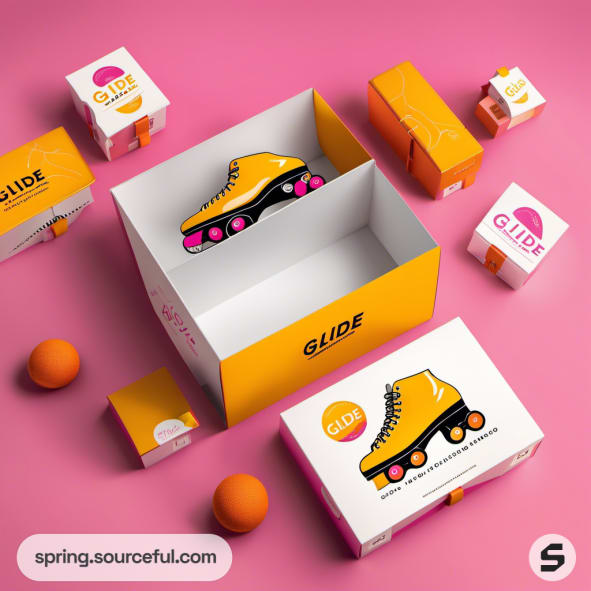 Colorful pink box with teal skates and accessories on yellow background.