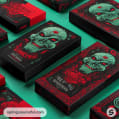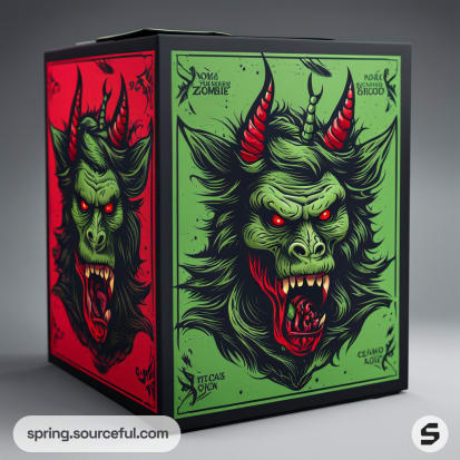 Box with red and green zombie design featuring a fierce mythical creature with glowing eyes.