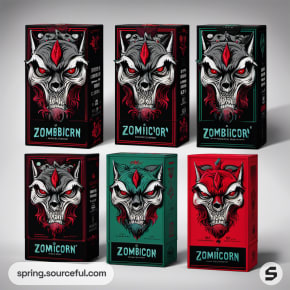Two rectangular boxes with zombie unicorn illustrations, one green and one black, featuring red accents.
