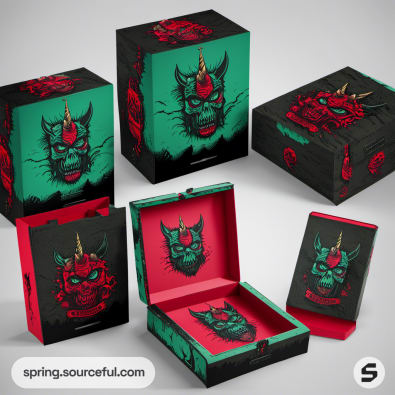 Colorful mailer boxes with green and red demon illustrations, featuring a horned skull on the lids and sides.