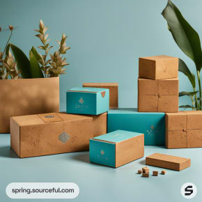 Stacked kraft and teal boxes with leaf design, set against a soft blue background.