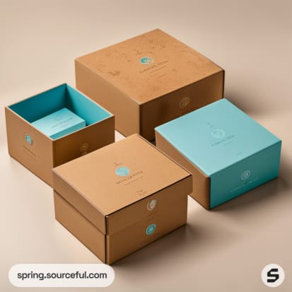 Set of brown and teal open and closed boxes with a minimalist design on a beige background.
