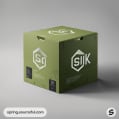 Large olive green cube box with logo and text.