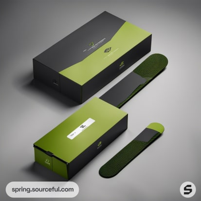 Sleek black and green shoe boxes with accessories.