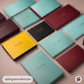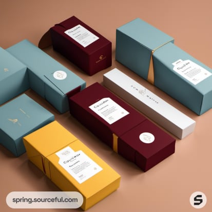 Assorted colorful boxes in burgundy, yellow, and teal.