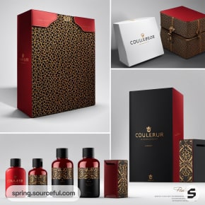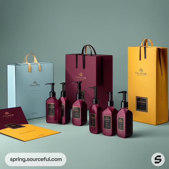 Elegant packaging with burgundy, white, and gold bottles and bags.