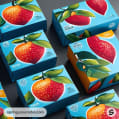 Colorful fruit graphics on blue mailer boxes with varied fruit designs.