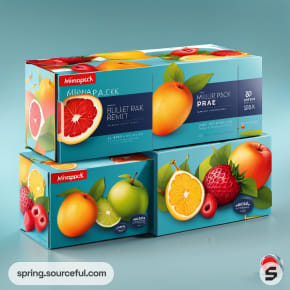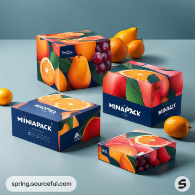 Colorful fruit-themed packaging with blue background and assorted fruits on mailer boxes.