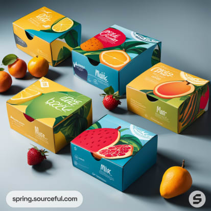 Assorted fruit graphics on vibrant mailer boxes with matching backgrounds.