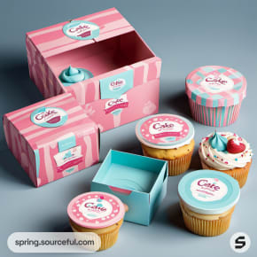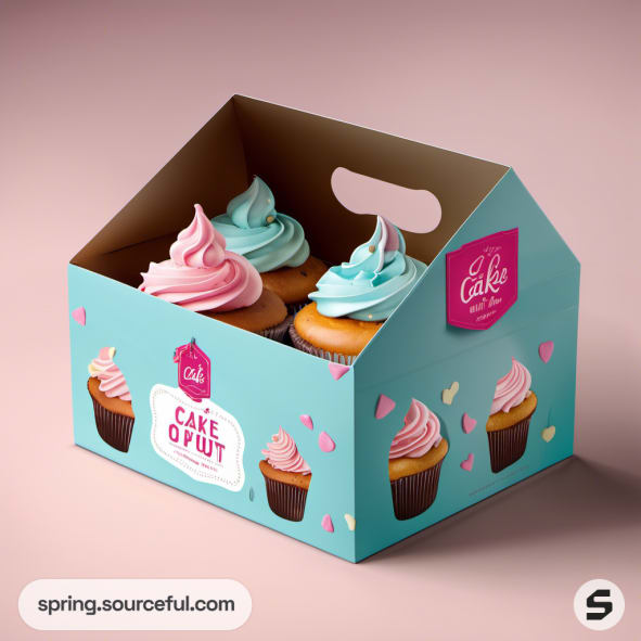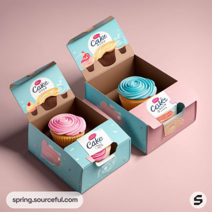Packaging with cupcake illustrations and window cutouts on a pastel background.