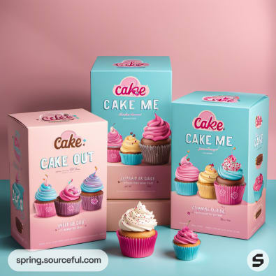 Three cupcake boxes: Aqua, pink, and teal with illustrated cupcakes on pastel background.