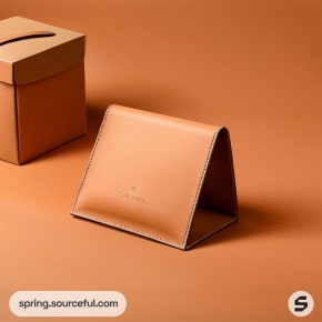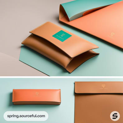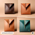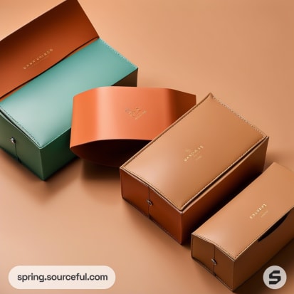 Luxury branded leather gift boxes in green and brown on a beige background.