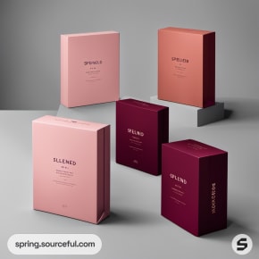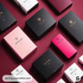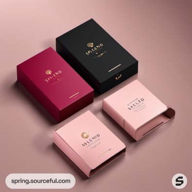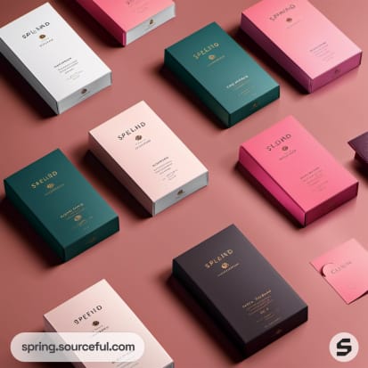 Various packaging boxes in dark green, pink, and black arranged on a burgundy surface.