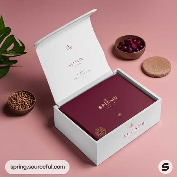 Flat maroon and white box on a soft pink background.