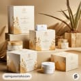 Assorted elegant beige boxes with intricate gold patterns and minimalist text, arranged on a neutral background.