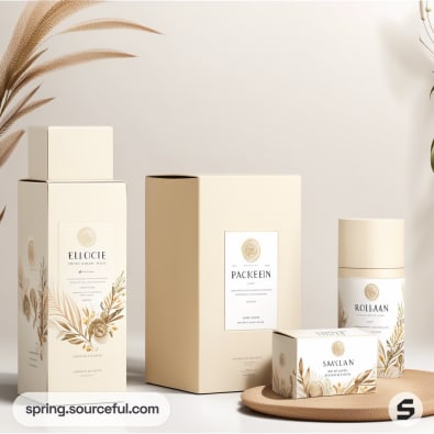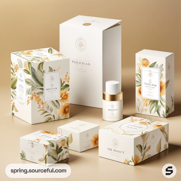 Beige skincare packaging with floral design, including tall boxes and jars, on a light surface.