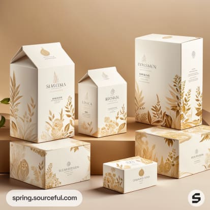 Elegant cardboard boxes with intricate gold patterns and minimalist design on a beige background.