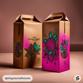 Various cardboard boxes with floral designs and vibrant colors on a pink background.