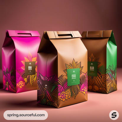 Colorful coffee bags with floral designs and handles on a brown background.
