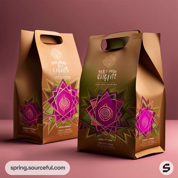 Brown paper bags with pink geometric floral designs and cut-out handles on a pink background.