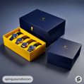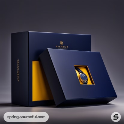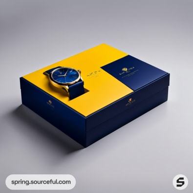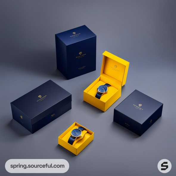 Navy and yellow watch packaging with watches displayed.